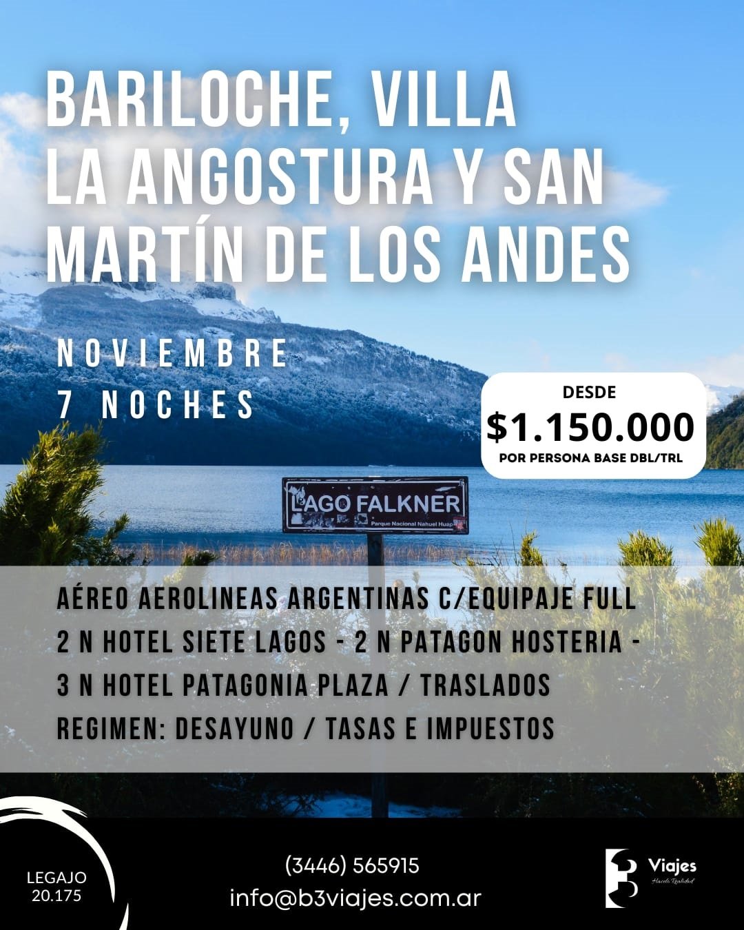 El paquete incluye: Aéreos + Traslado Aeropuerto Bariloche / Hotel Bariloche + Alojamiento con Desayuno: 2 noches en Bariloche + Traslado en excursión Bariloche – Villa La Angostura +2 noches en Villa La Angostura + Excursión San Martin de los Andes por 7 lagos desde Villa La Angostura + 3 noches en San Martín de Los Andes + Asistencia al viajero.